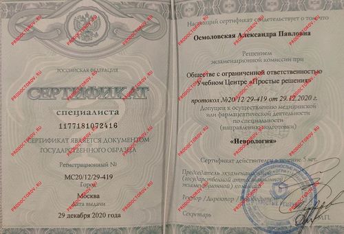 Сертификат Неврология 1177181072416 №МС20/12/29-419 г. Москва 29 декабря 2020г, выдан ООО Простые решения