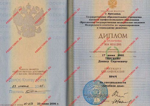 Диплом лечебное дело ВСА 035 1285 от 17 июня 2005г. Ярославская государственная медицинская академия