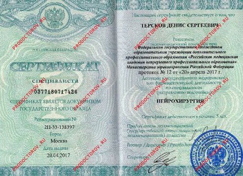 Сертификат 0377180717426 №211-33-138397 от 20.04.2017г нейрохирургия, выдан: Российская медицинская академия непрерывного профессионального образования