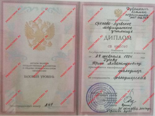 Диплом по специальности фельдшер СБ69?0707 от 29 февраля 1984г. Орехово-зуево медицинское училище